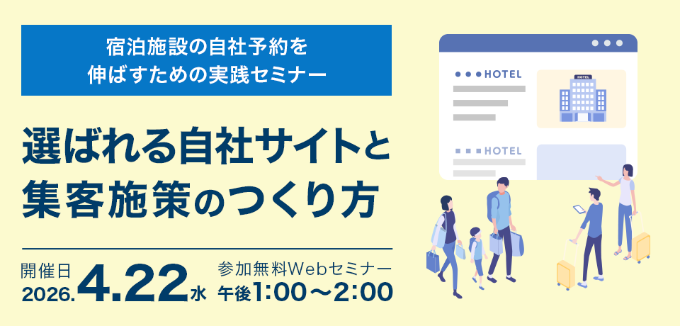 これから自社集客に取り組みたい宿泊施設様はもちろん、現在の施策を見直し、より成果につなげたいとお考えの方にとって、今後の取り組みを検討するためのヒントを得られる内容です。